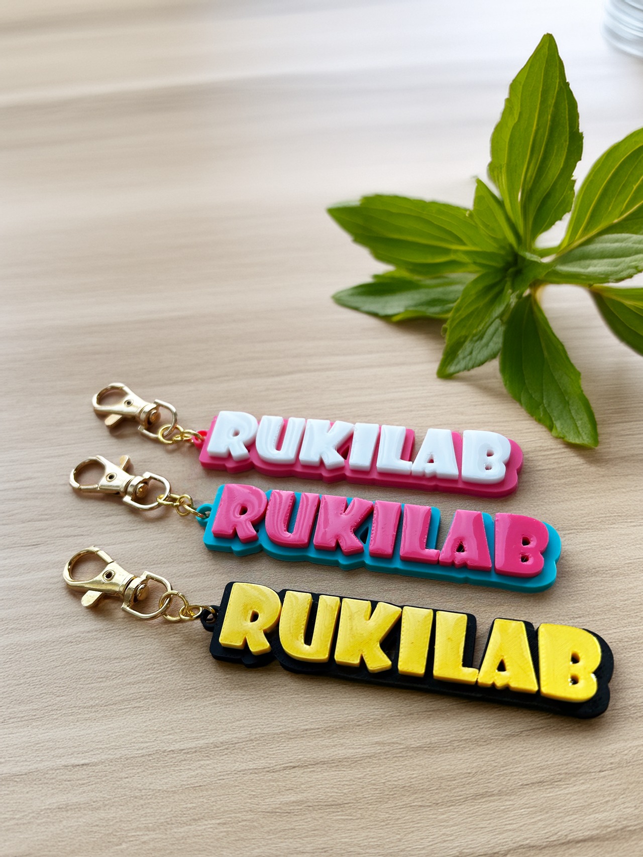 ・2色×立体:上段(文字)と下段(ベース)を別色で成形。正面からも側面からも立体感が映えます。
